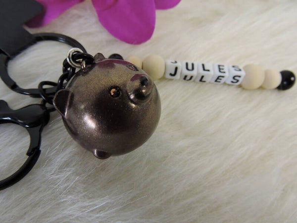 porte clés "z'animobulle" ours en résine marron foncé métallisé + tige prénom JULES (peut etre changé max 7 lettres ) avec perles en bois + petit mousqueton