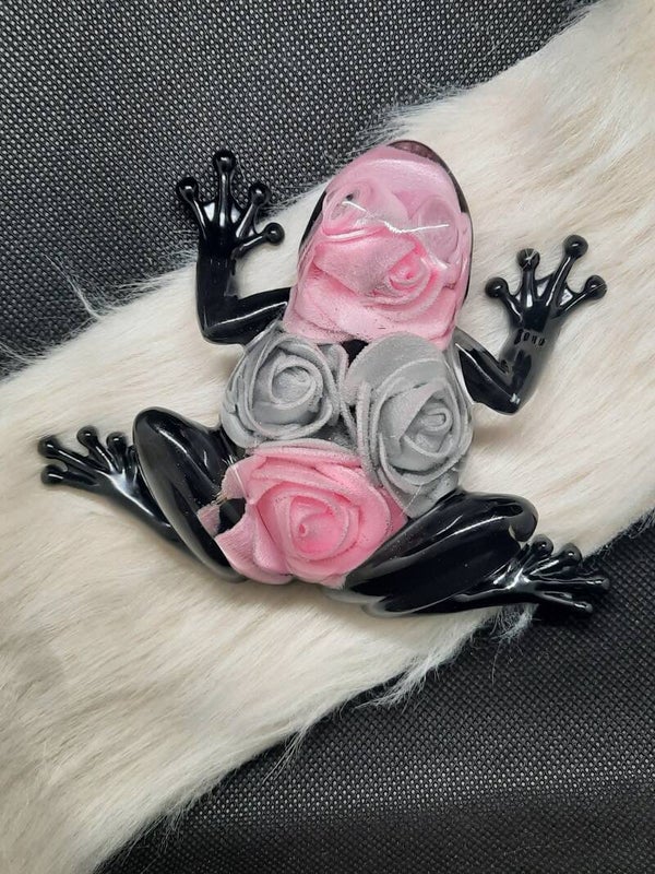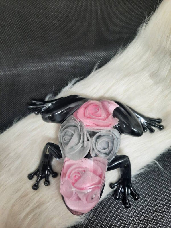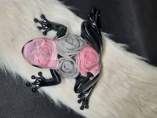grenouille décorative en résine epoxy avec fleurs en mousse rose et grise incrustées sur le dessus sur un fond noir