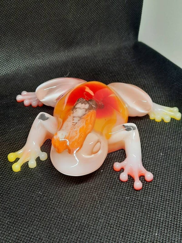 grenouille décorative en résine epoxy avec fleurs rouge et jaune , cigale en résine orange e blanche et papillon incrustés sur le dessus sur un fond blanc légèrement phosphorescent