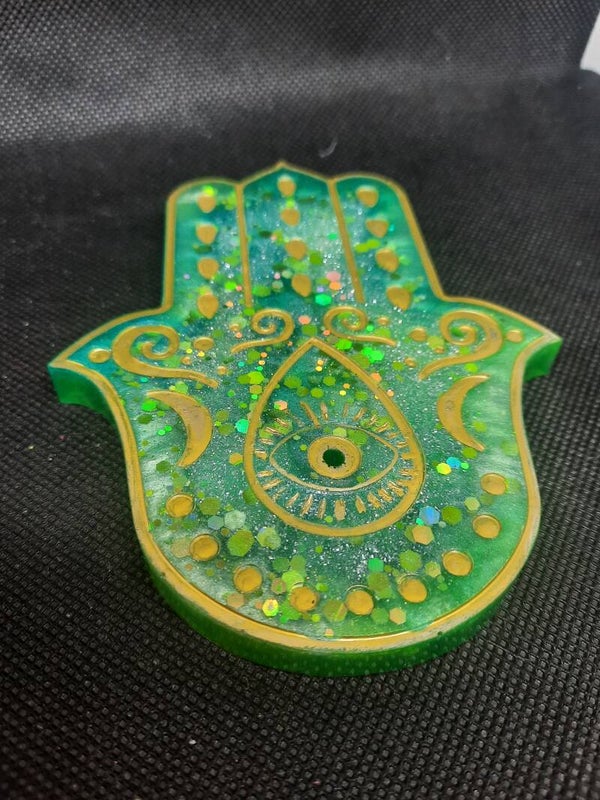 Porte encens en résine epoxy , fait mains , modèle unique dans des nuances de vert avec paillettes et motifs dorés