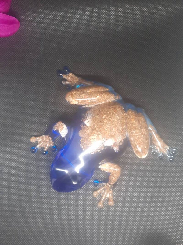grenouille décorative en résine epoxy effet plage avec sable et coquillages incrustés sur un fond bleu