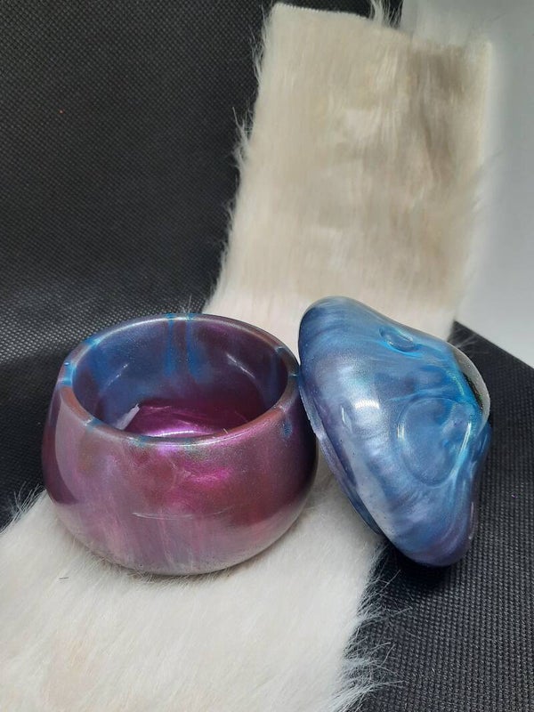 Petite boîte en forme de champignon en résine epoxy , faite mains , un modèle unique dans des tons violet/bleu clair/bleu canard avec "pointe" du couvercle noire pailletée