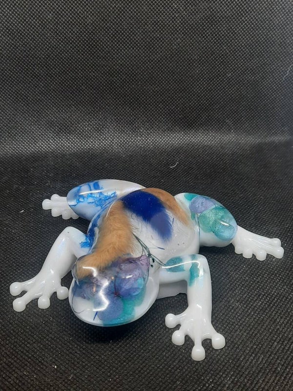 grenouille décorative en résine epoxy avec fleurs séchées dans des tons bleus et beiges incrustées sur un fond blanc