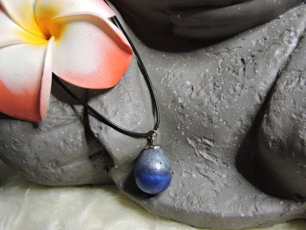 collier avec pendentif en résine , fait mains, modèle unique en forme de goutte dans les tons bleus / bleu argentés montée sur cordon noir
