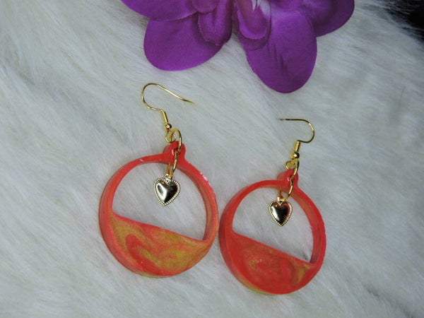 Boucles d'oreilles dans des couleurs rouges et jaunes nuancées avec coeur doré suspendu sur crochet en acier doré
