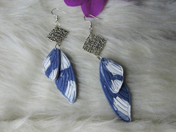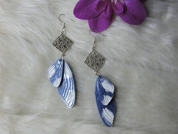 Boucles d'oreilles composées d'ailes de libellules en résine bleues et blanches et d'une breloque argentée montées sur crochets en acier , faites mains en modèle unique