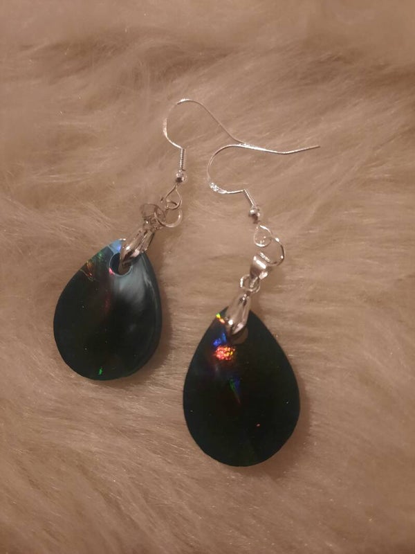 Boucles d'oreilles faites mains en modèle unique , en résine bleues foncées / noires avec effet holographique montées sur crochets en acier argentés