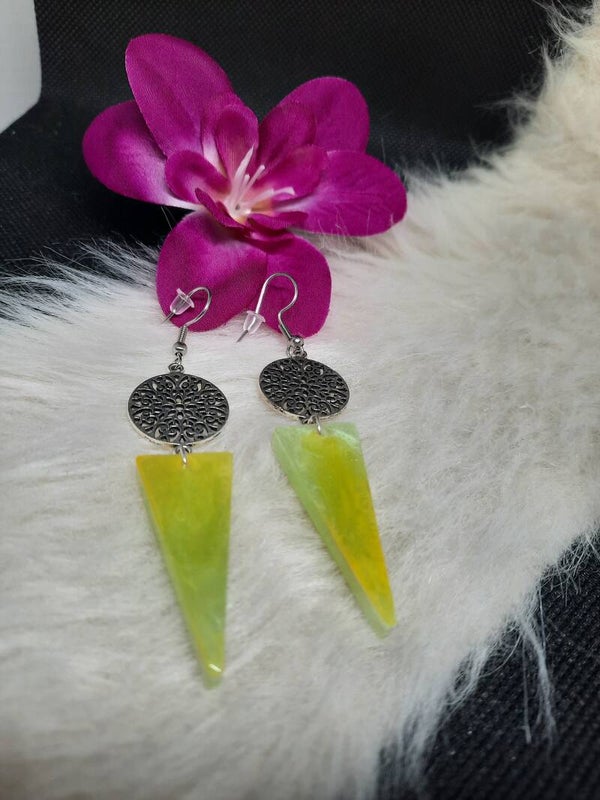 Boucles d'oreilles faites mains en modèle unique , composées d'un triangle en résine dans les tons jaunes et d'une breloque ronde avec motifs argentée montées sur crochets en acier argentés