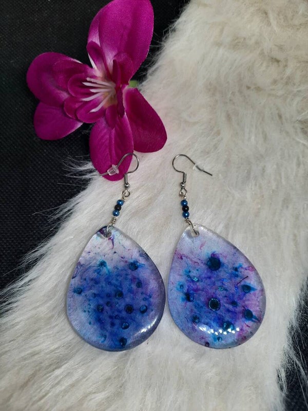 Boucles d'oreilles faites mains en modèle unique , en résine transparentes, bleues et violets "effet paon" et perles bleues et noires montées sur crochets en acier argentés