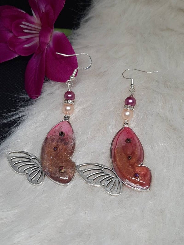 Boucles d'oreilles faites mains en modèle unique , composées d'un papillon en acier argenté et résine dans des tons roses et doré et de perles montées sur crochets en acier argentés