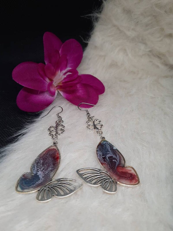 Boucles d'oreilles faites mains en modèle unique , composées d'un papillon en acier argenté et résine dans des tons bleu et rouge et d'un trèfle argenté montées sur crochets en acier argentés