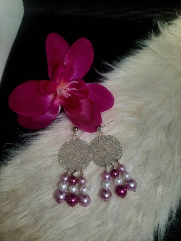 boucles d'oreilles faites mains en modèle unique ; composées d'un cercle décoré de motifs en acier argenté et de perles roses et blanches montées sur clous argentés