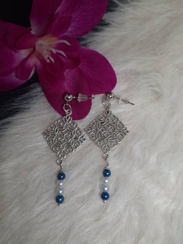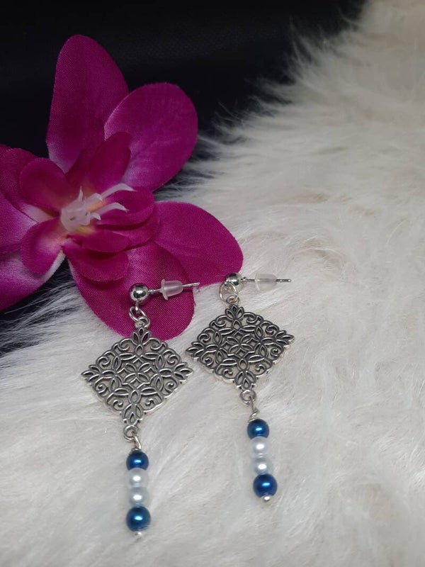 boucles d'oreilles faites mains en modèle unique ; composées d'une breloque en acier argenté et de perles bleues et blanches montées sur clous argentés