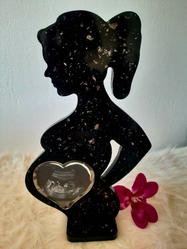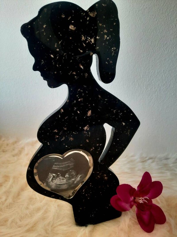 Femme enceinte sur socle avec emplacement pour mettre une petite photo , fait mains en modèle unique en résine noir et argenté