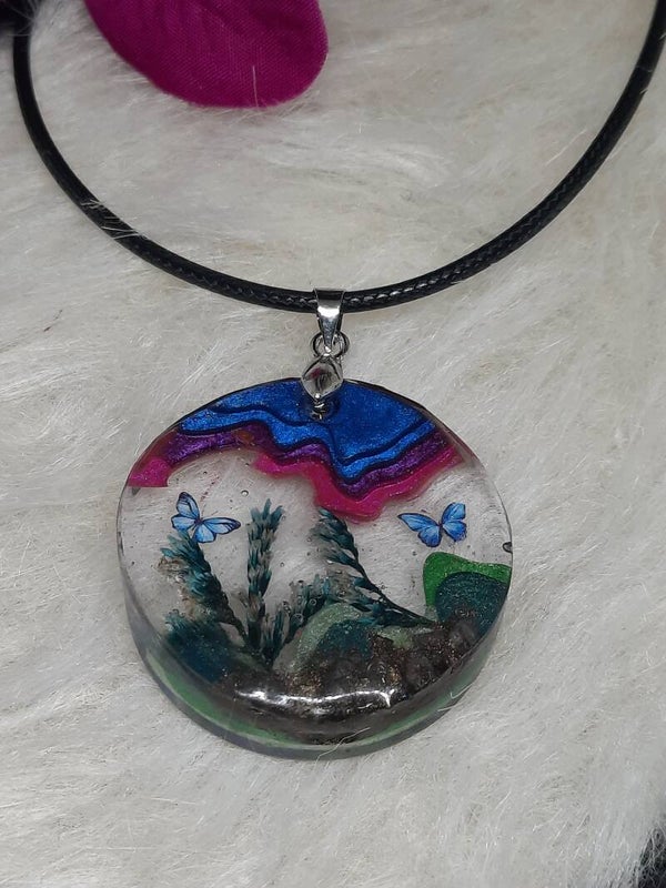 collier fait mains en modèle unique , avec un pendentif en résine décor paysage en relief monté sur cordon noir
