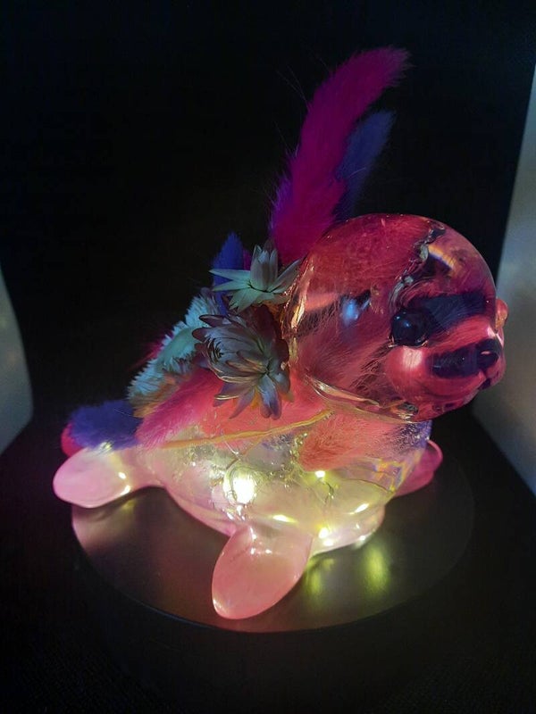Composition faite mains en modèle unique , phoque en résine avec lumière blanche et fleurs séchées incrustées et sur le dessus dans des tons rose/violet