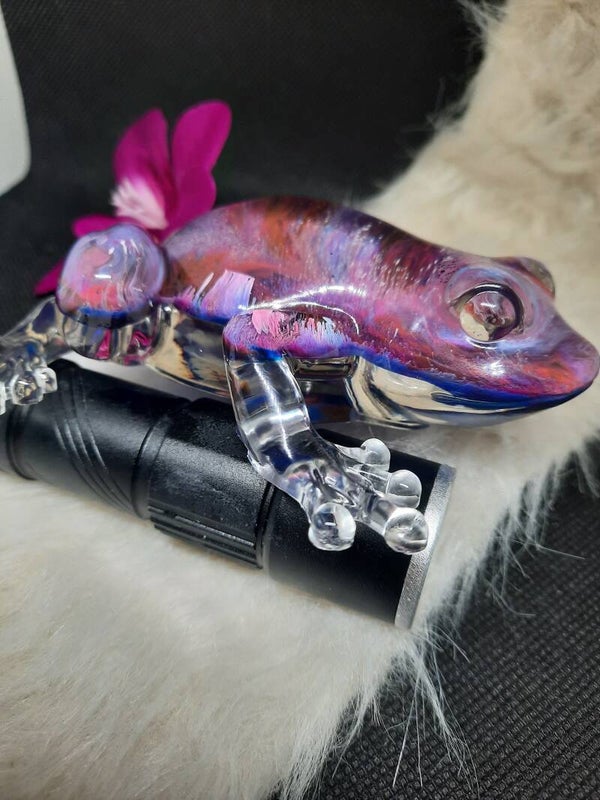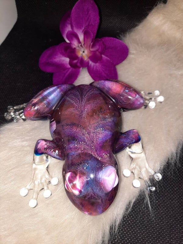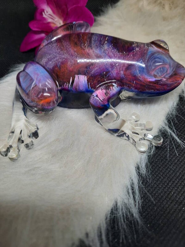 Grenouille décorative en resine , faite mains en modèle unique , dans des couleurs bleue/rose/violet/doré en mélange et transparente