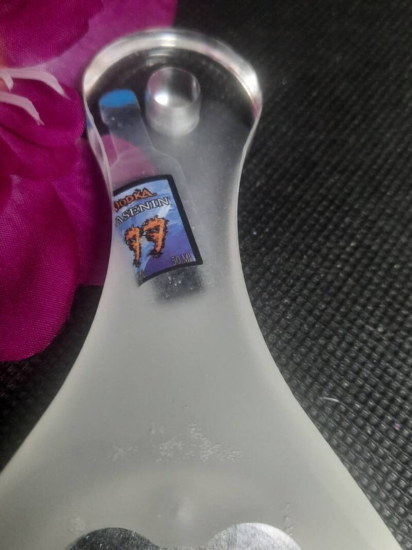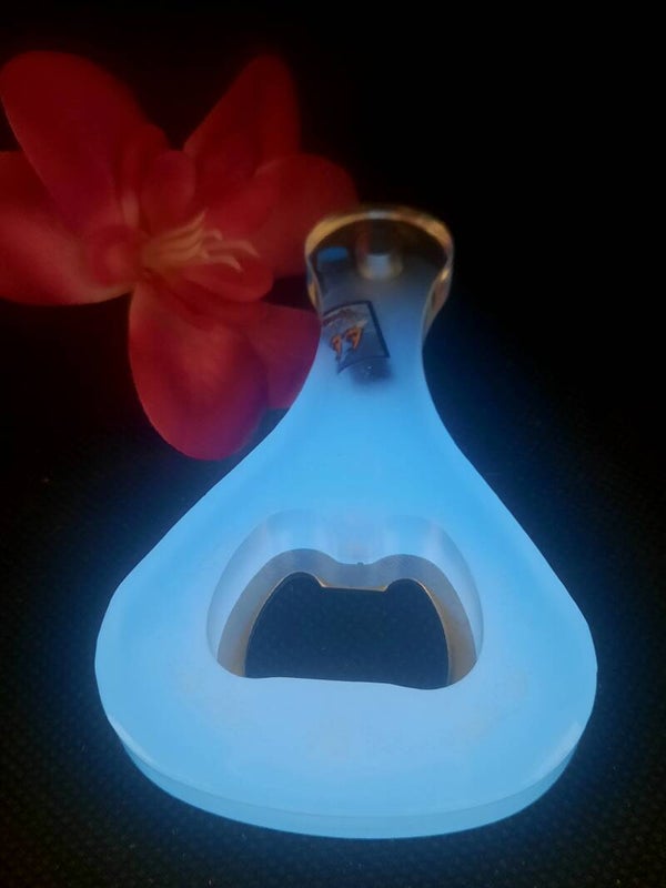 Décapsuleur en résine, fait mains en modèle unique , avec petite bouteille décorative incrustée , de couleur blanc/jaune clair et devient phosphorescent bleu à l'obscurité (sous réserve d' exposition à la lumière )