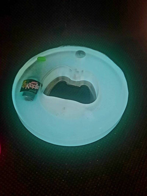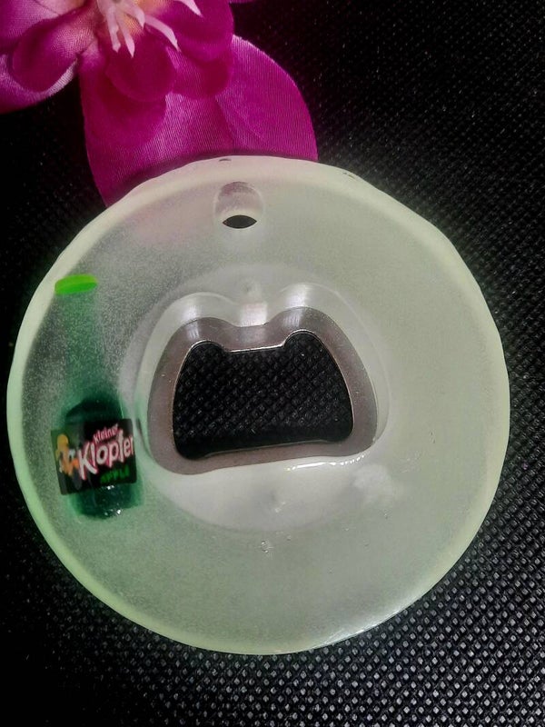Décapsuleur en résine , fait mains en modèle unique , avec une petite bouteille décorative incrustée, il devient vert phosphorescent à l'obscurité (sous réserve d'exposition à la lumière du jour )