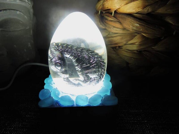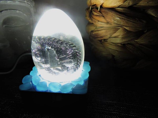 Petite veilleuse oeuf de dragon transparent avec dragon noir et effet caméléon à l'interieur en résine sur socle lumineux (blanc) avec branchement par prise usb orné de pierres phosphorescentes
