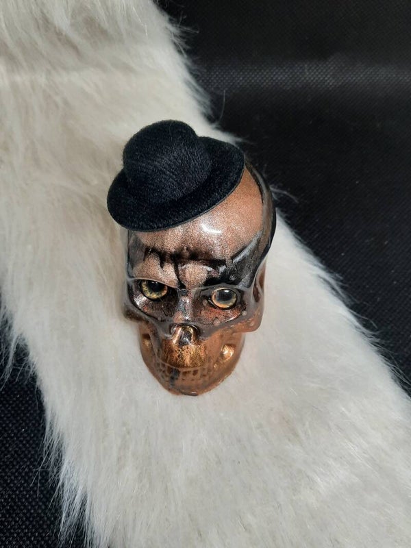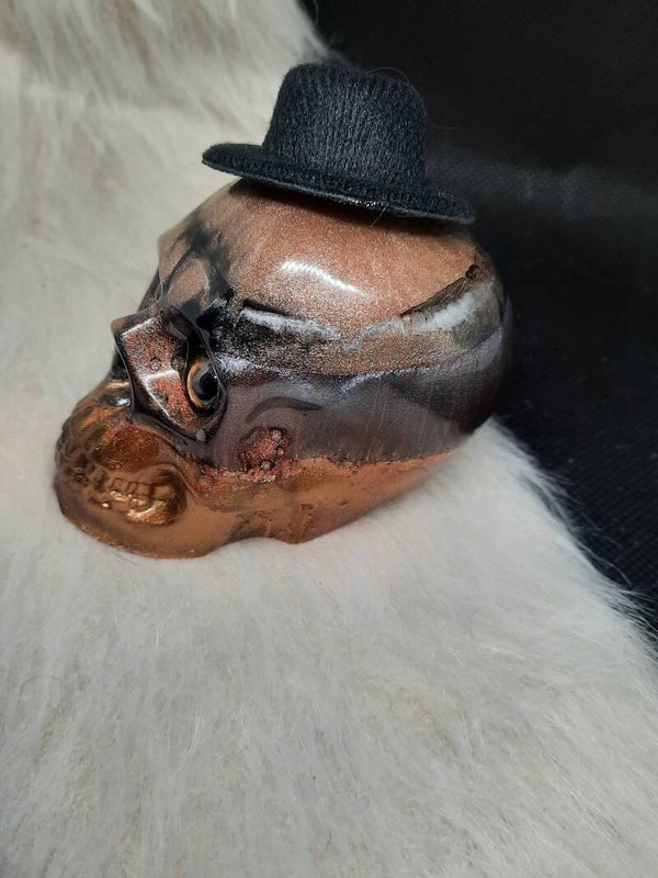 crâne / tête de mort fait mains en modèle unique en résine dans des tons marrons/noir avec chapeau noir et yeux