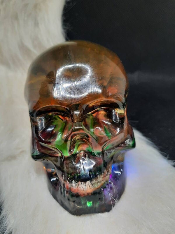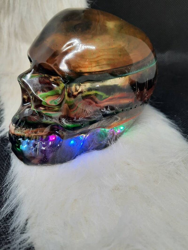 skull / tête de mort fait mains en modèle unique , en résine multicolore avec lumière incrustée (fonctionne à piles)