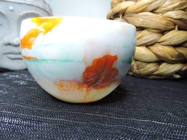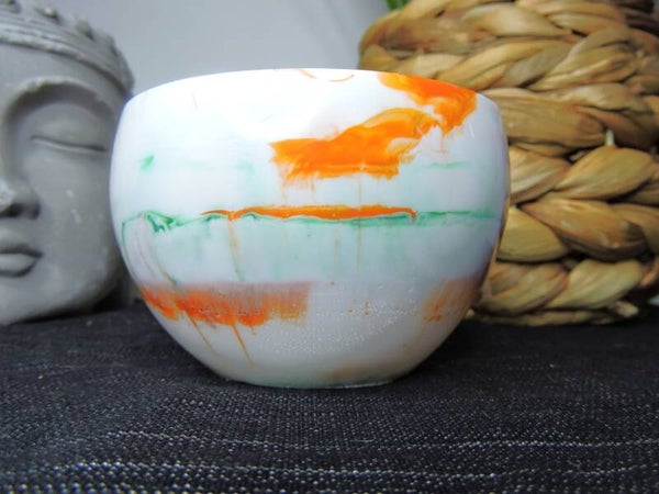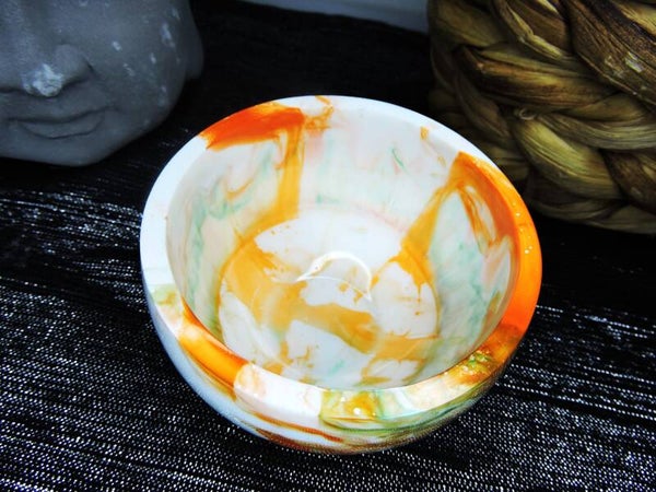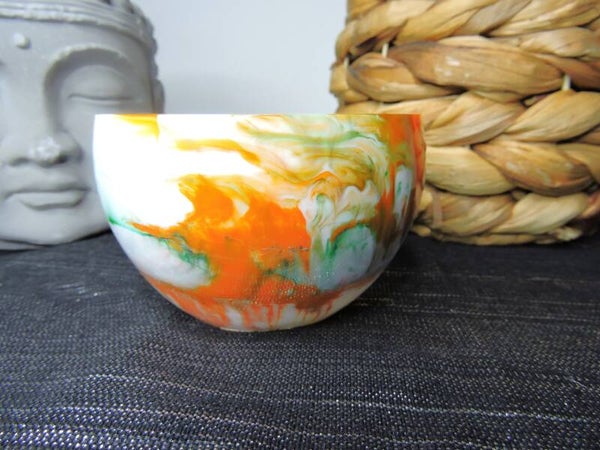 Contenant rond en résine , dans un mélange de orange/vert et blanc