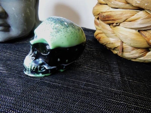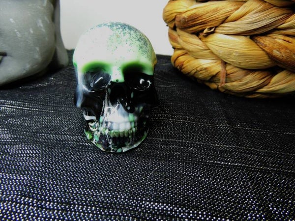 skull / tête de mort fait mains en modèle unique , en résine ,vert/noir et blanc avec incrustation de paillettes sur le haut