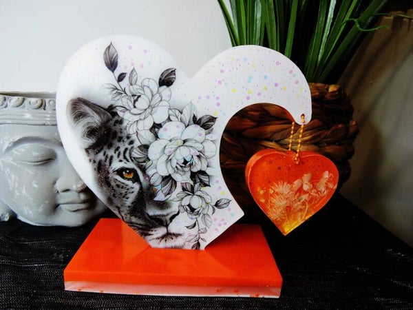Décoration en résine coeur en suspension sur grand coeur posés sur un socle , socle orange ou blanc pailleté (réversible) grand coeur blanc pailleté avec dessin tête de léopard et fleurs incrusté et petit coeur orange avec fleurs séchées blanches incrustées