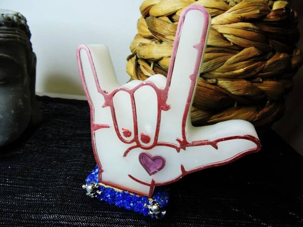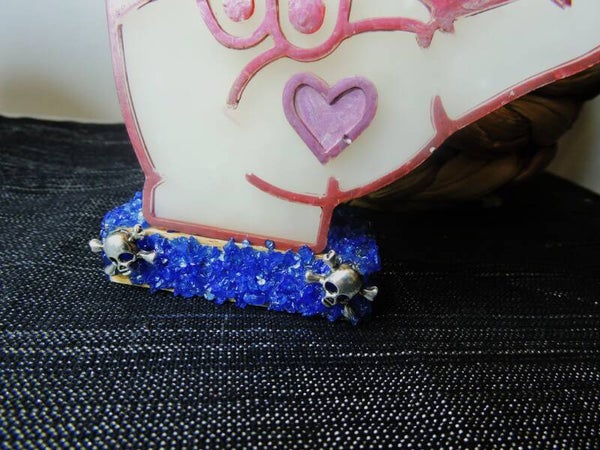 main en résine blanche phosphorescente avec contours rouges et socle orné de concassage de pierres bleu et tête de mort en acier argenté