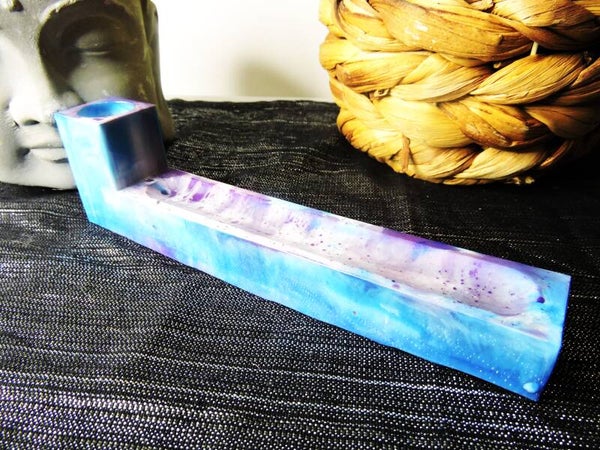 porte encens long avec logement à bougie (attention logement décoratif , je recommande de ne pas allumer la bougie) en résine , dans un mélange de couleurs bleu et violet