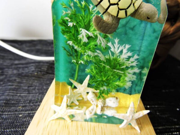 composition veilleuse en résine , décor fond marin avec tortue / plantes et coquillages sur socle lumineux (lumière blanche) en bois à branchement usb