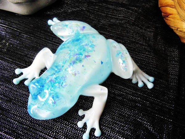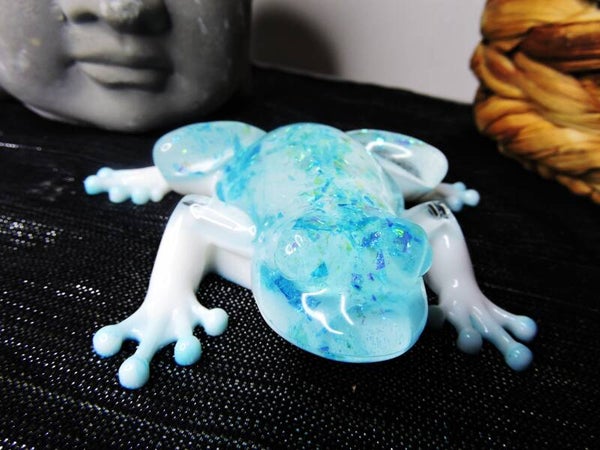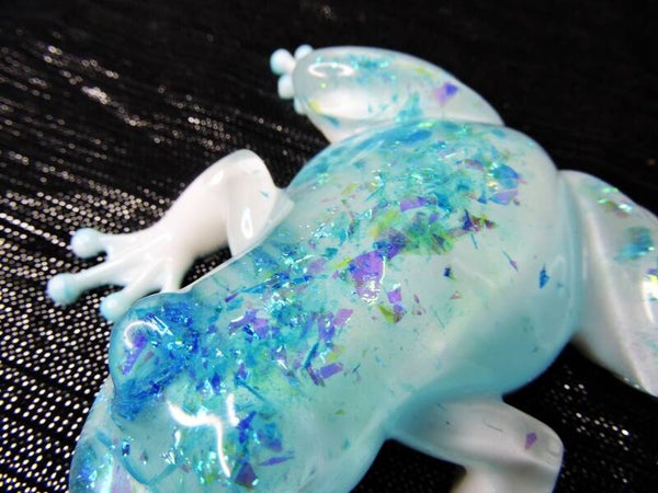 grenouille décorative en résine epoxy blanche et bleu clair avec confettis holographique incrustés
