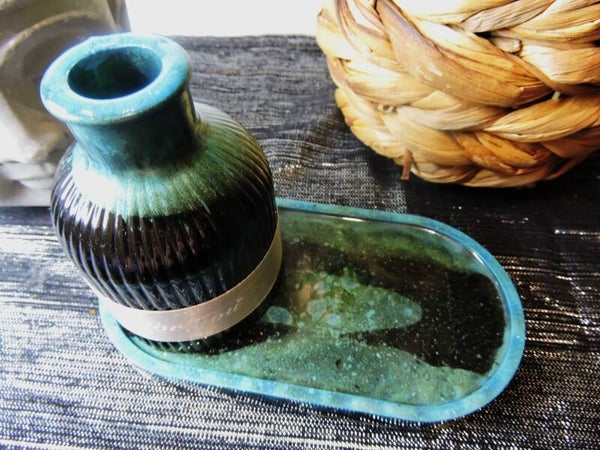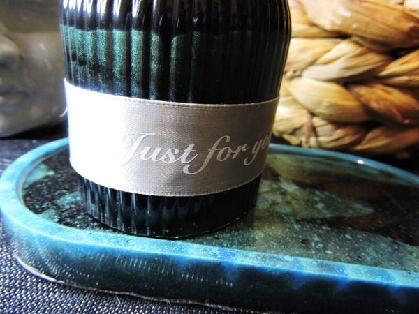 vase sur petit plateau en résine , pour fleurs artificielles (pas d eau ) dans un mélange de verts avec banderole "just for you"