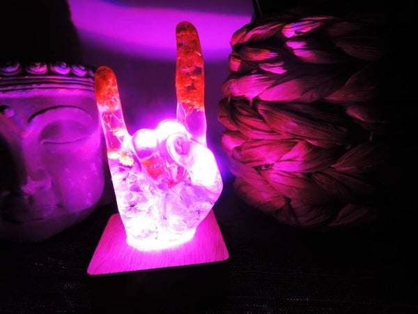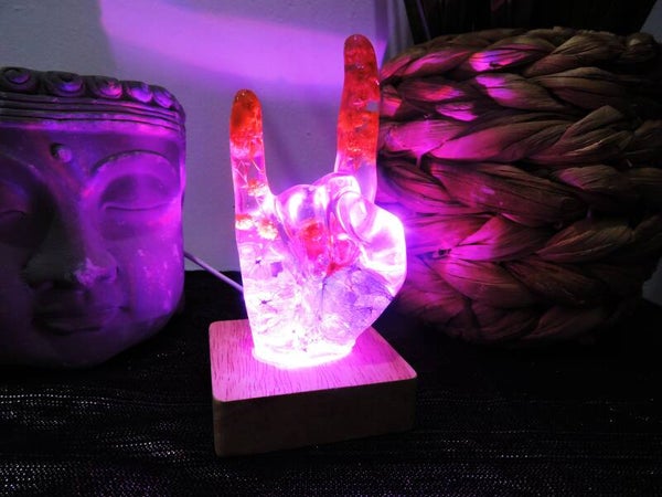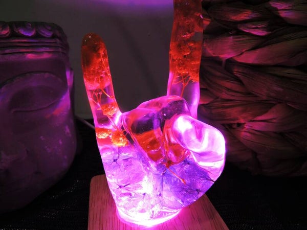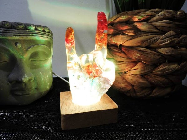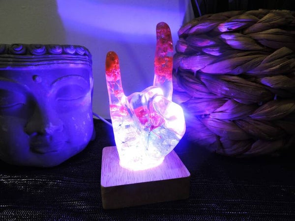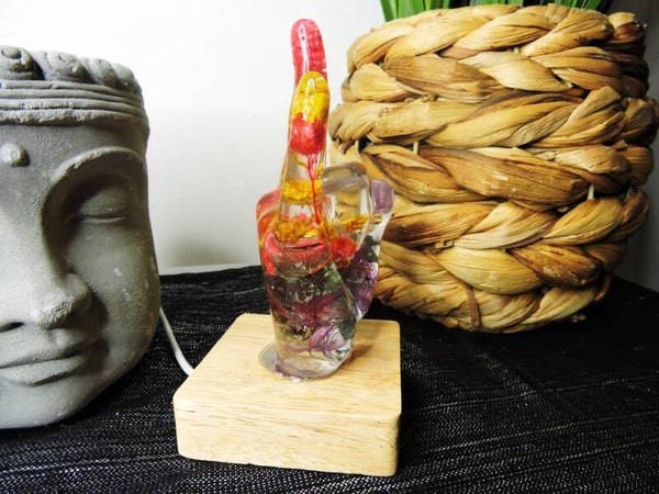 veilleuse main transparente avec fleurs séchées incrustées en résine sur socle lumineux multicolore (branchement usb)