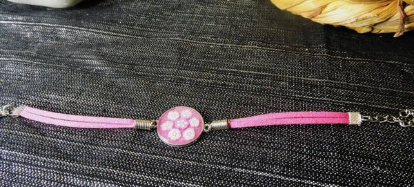 médaillon en acier et résine à motif fleurs sur cordon rose
