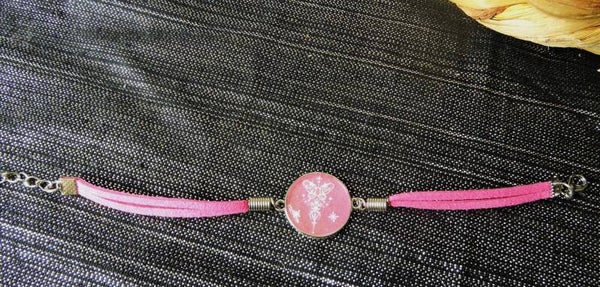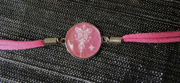 médaillon en acier et résine à papillon en forme d'attrappe rêves sur cordon rose