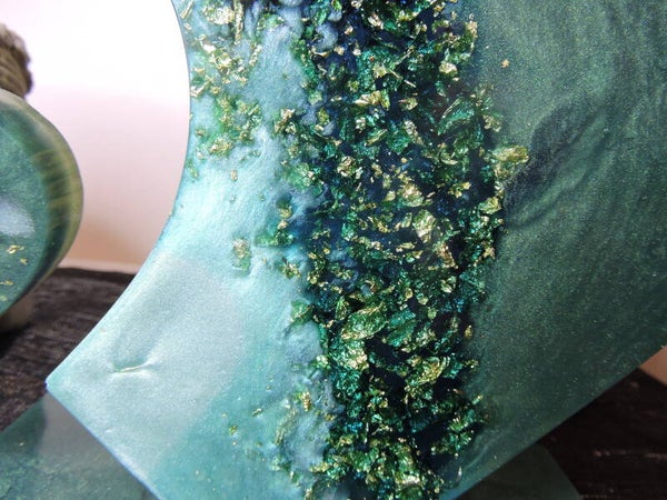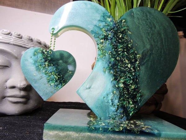 Décoration en résine coeur en suspension sur grand coeur avec lumiere led bleue incrustée (fonctionne à pile ) posés sur un socle , dans des tons vert et incrustation de confettis dorées