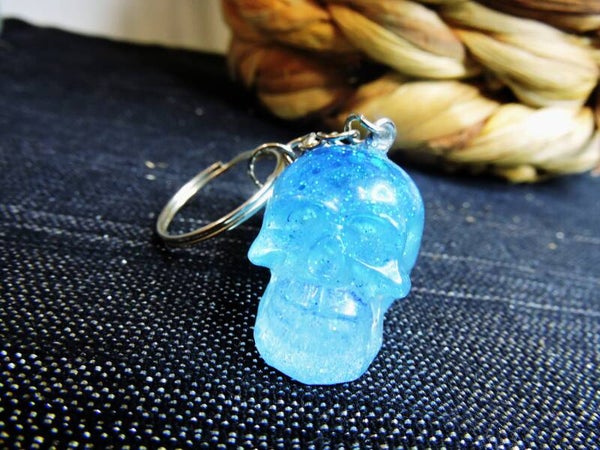 porte clés skull/ tête de mort en résine bleu clair avec paillètes