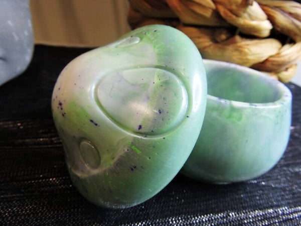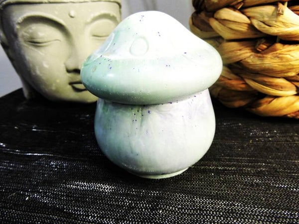 Boite en résine en forme de champignon , dans des tons vert clair et violet