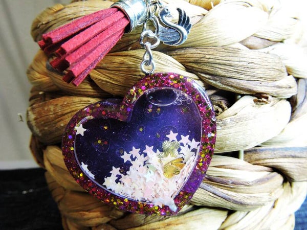 Porte clès fait mains en modèle unique , composé d'un coeur en résine pailleté rose et jaune avec inclusion d'étoiles brillante et de coeurs dorés en effet shaker (mouvement avec l'eau) orné d'une pampille et d'une breloque