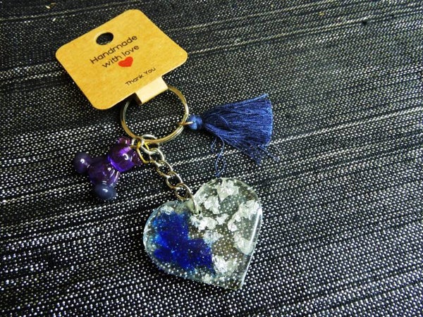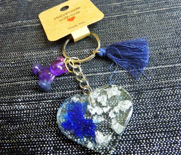 Porte clés en résine fait main en forme de coeur transparent et bleu avec incrustation de paillettes de feuille argentée +ourson violet + pampille bleue