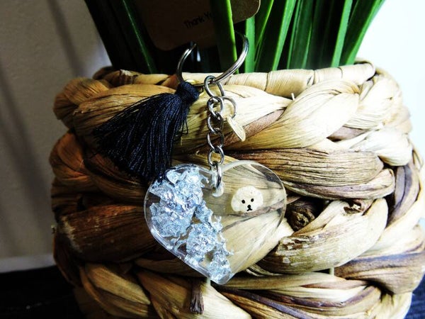 Porte clés en résine fait main en forme de coeur transparent avec inclusion de feuilles d'argent et d'une tête de caniche +ourson bleu+ pampille blanche