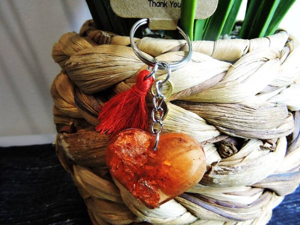 Porte clés en résine fait main en forme de coeur avec incrustation de feuilles cuivrées + coeur doré + pampille rouge orange