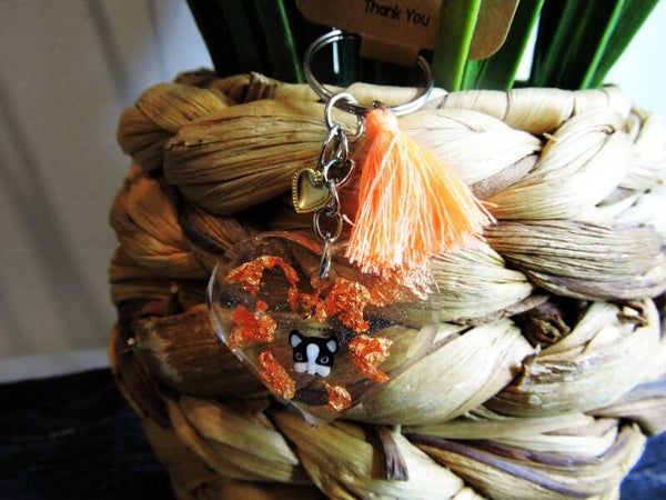 Porte clés en résine fait main en forme de coeur transparent avec incrustation de feuilles d'or et d'une tête de bouledogue +coeur doré + pampille orange