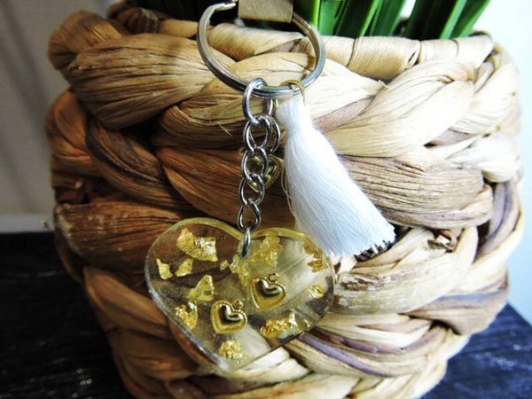 Porte clés en résine fait main en forme de coeur transparent avec incrustation de feuilles d'or et de 2 coeurs dorés + coeur doré + pampille blanche
