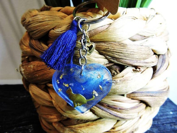 Porte clés en résine fait main en forme de coeur transparent et bleu avec incrustation de paillettes de feuille d'or et d'un chat doré + coeur doré + pampille bleue