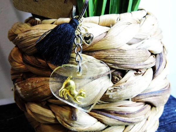 Porte clés en résine fait main en forme de coeur transparent avec chat doré incrusté +coeur doré+ pampille noire