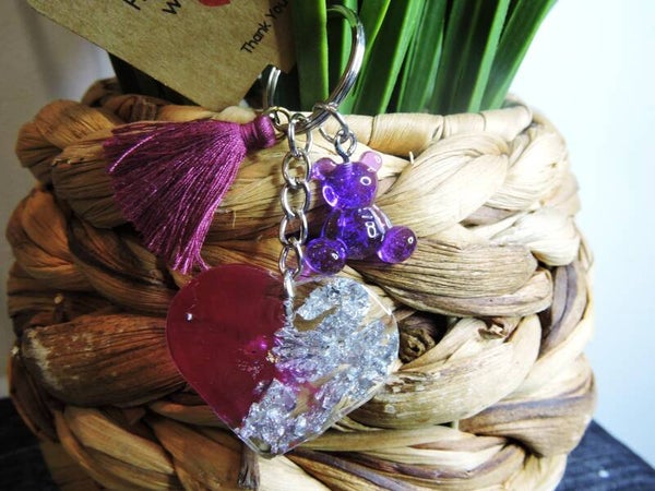 Porte clés en résine fait main en forme de coeur fushia et argenté +ourson en résine violet + pampille