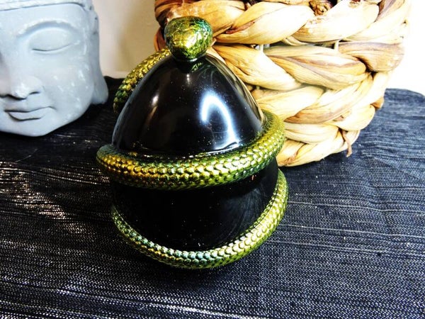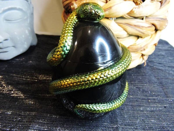 Boite en résine en forme d'oeuf noir avec un serpent nuancé vert et jaune enroulé autour